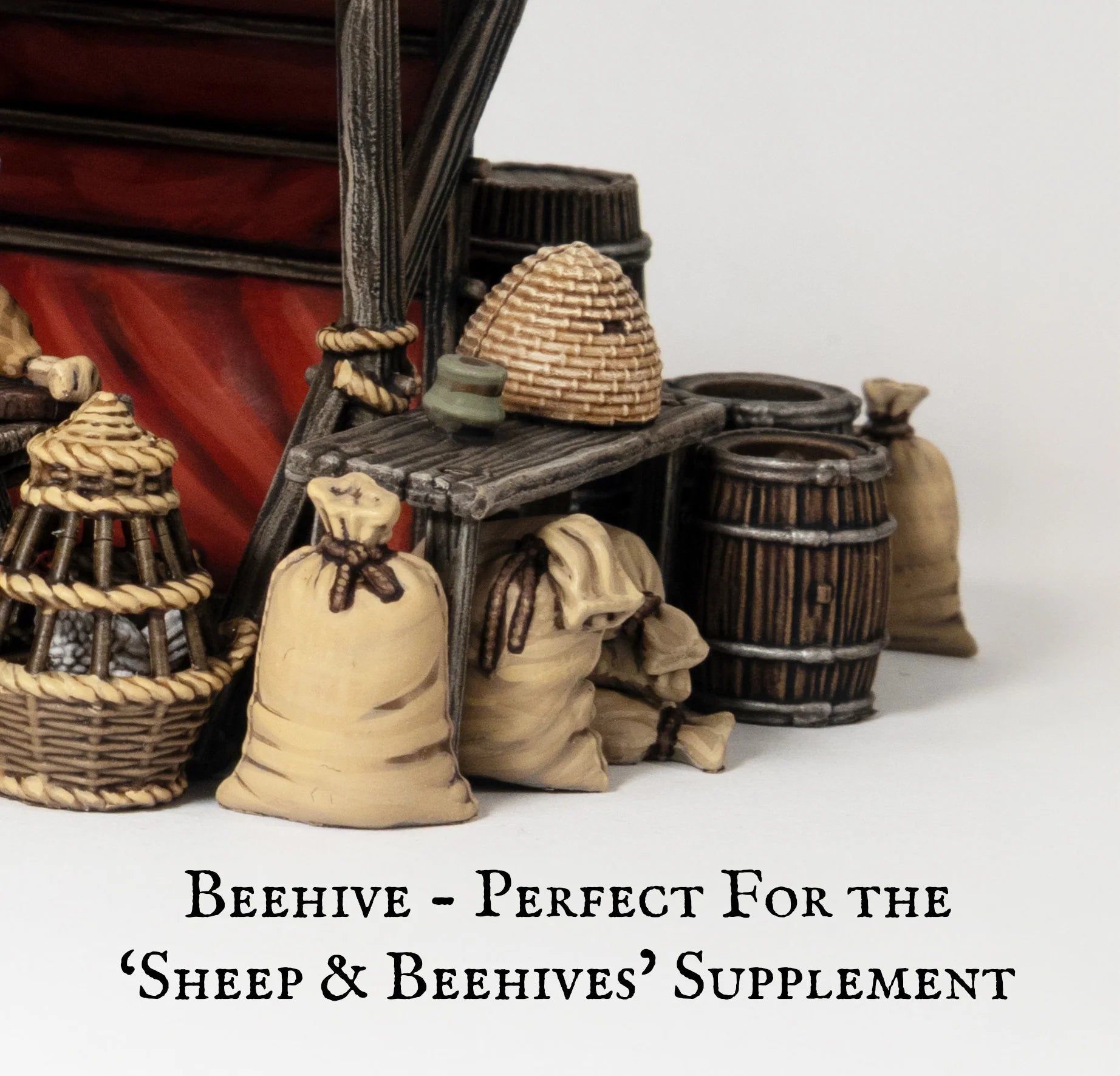 The barrels, pottery, furniture, and tools all take cues from authentic designs from foldable market stalls and sturdy feasting tables to clay furnaces, baskets, and sacks of grain. Even the poultry basket is based on period examples, made to hold a hand-painted chicken.