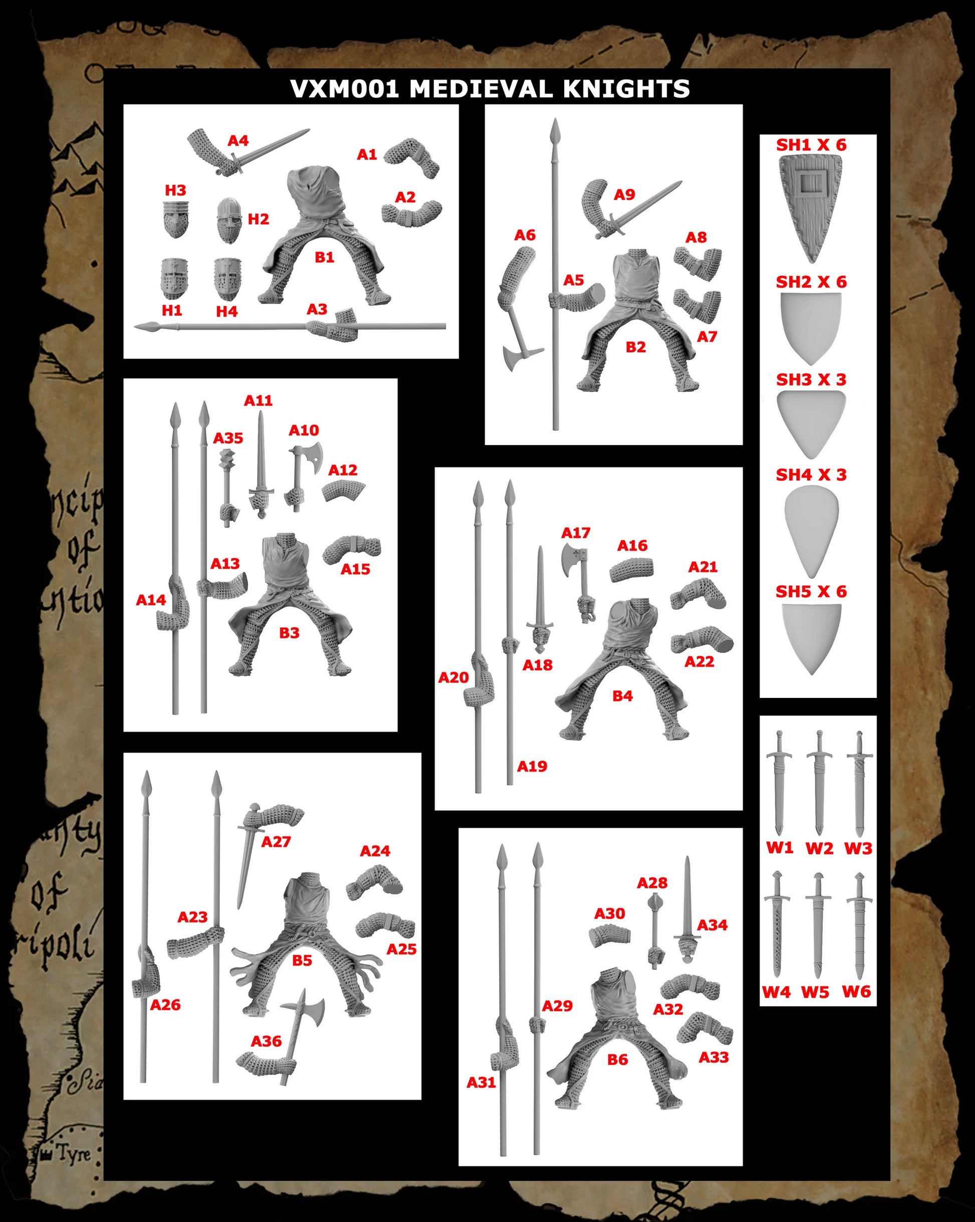 There is a massive choice of 18 heads in this set covering the varying and changing styles from the late 12th to the mid 13th Century. There are some open faced designs which then started to add the metal face guard and then to the completely enclosing barrel helms. Later Great helms and Sugar loaf helms will be covered in a later set.